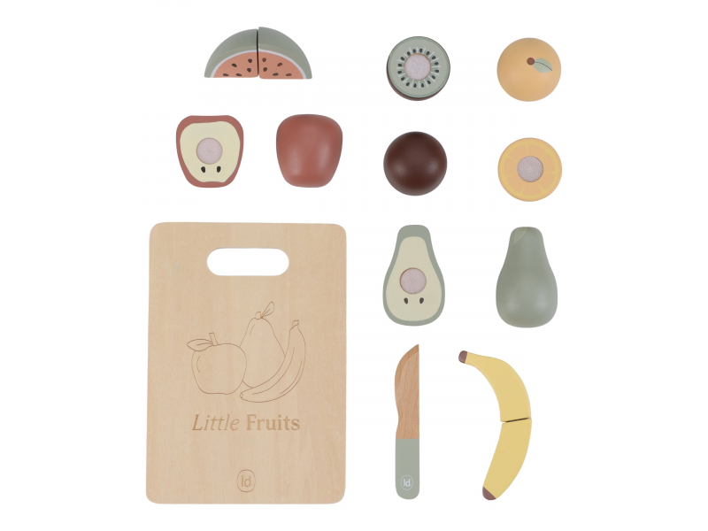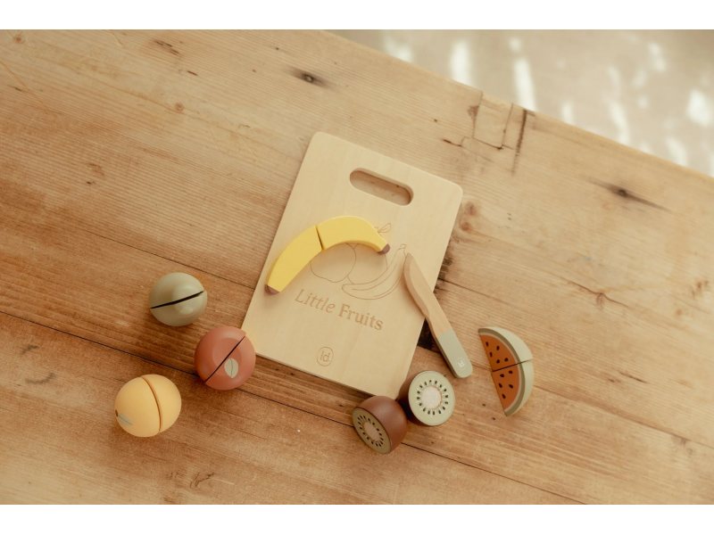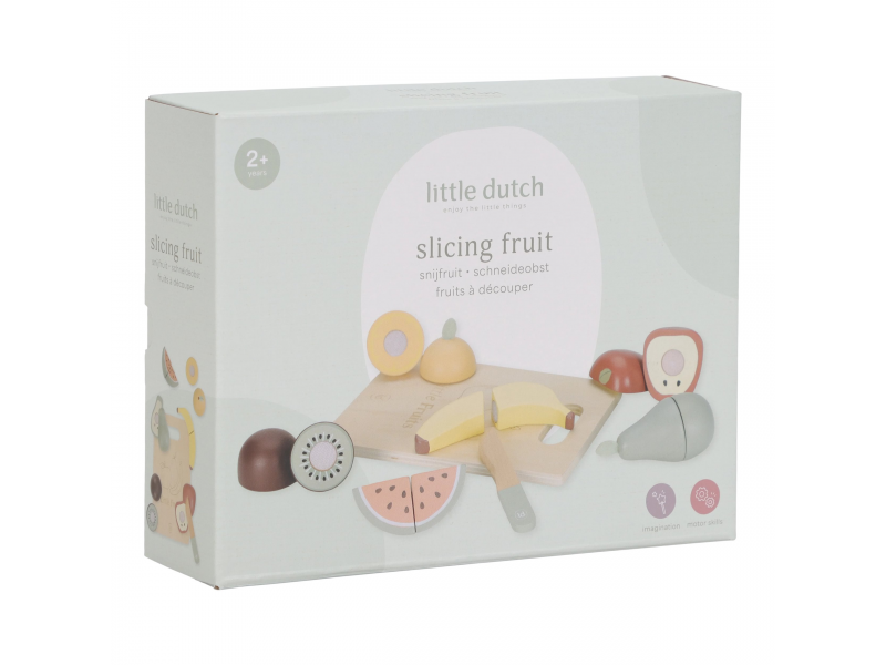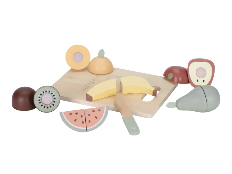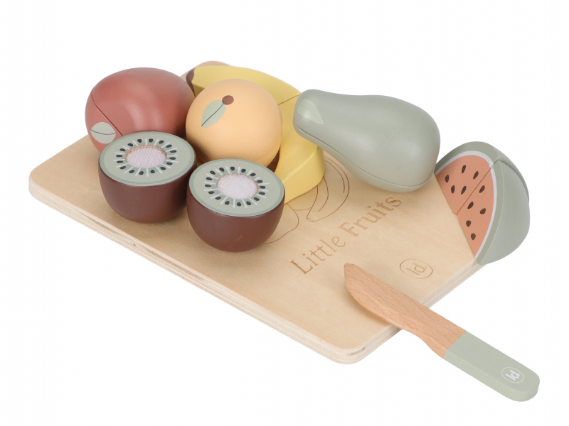 Pripravte ovocnú desiatu s touto veselou sadou dreveného krájacieho ovocia! V sade nájdete šesť druhov ovocia: jablko, hrušku, banán, kivi, pomaranč a kúsok melónu – každý z nich je možné rozkrojiť dreveným nožíkom na dve polovice a vďaka suchému zipsu ich opäť ľahko spojíte späť.