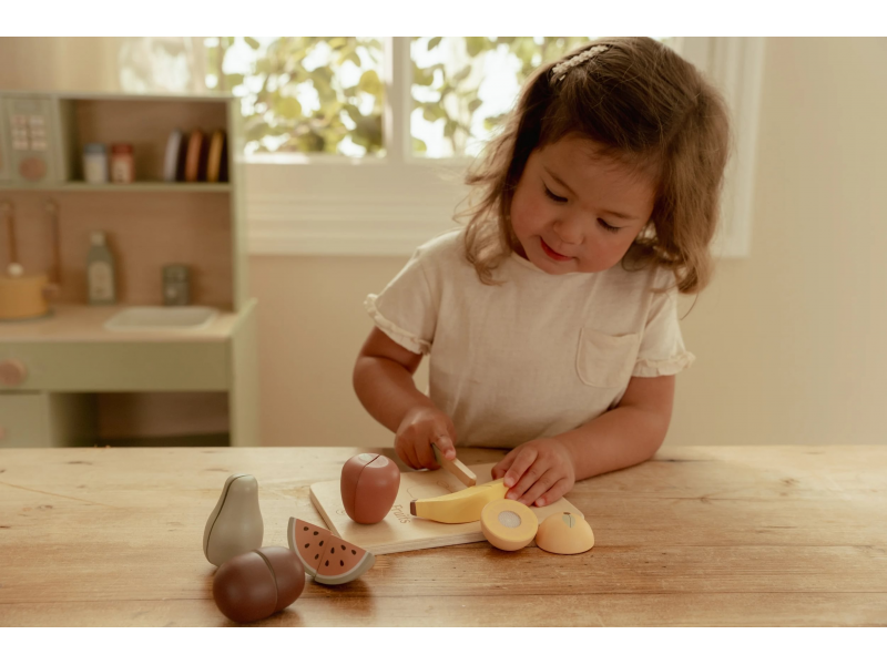 Súčasťou sady je aj doska na krájanie a drevený nôž, takže si malí kuchári môžu vyskúšať prípravu zdravej desiaty presne ako dospelí. Skvelý spôsob, ako rozvíjať jemnú motoriku, koordináciu ruky a oka aj hru na role.