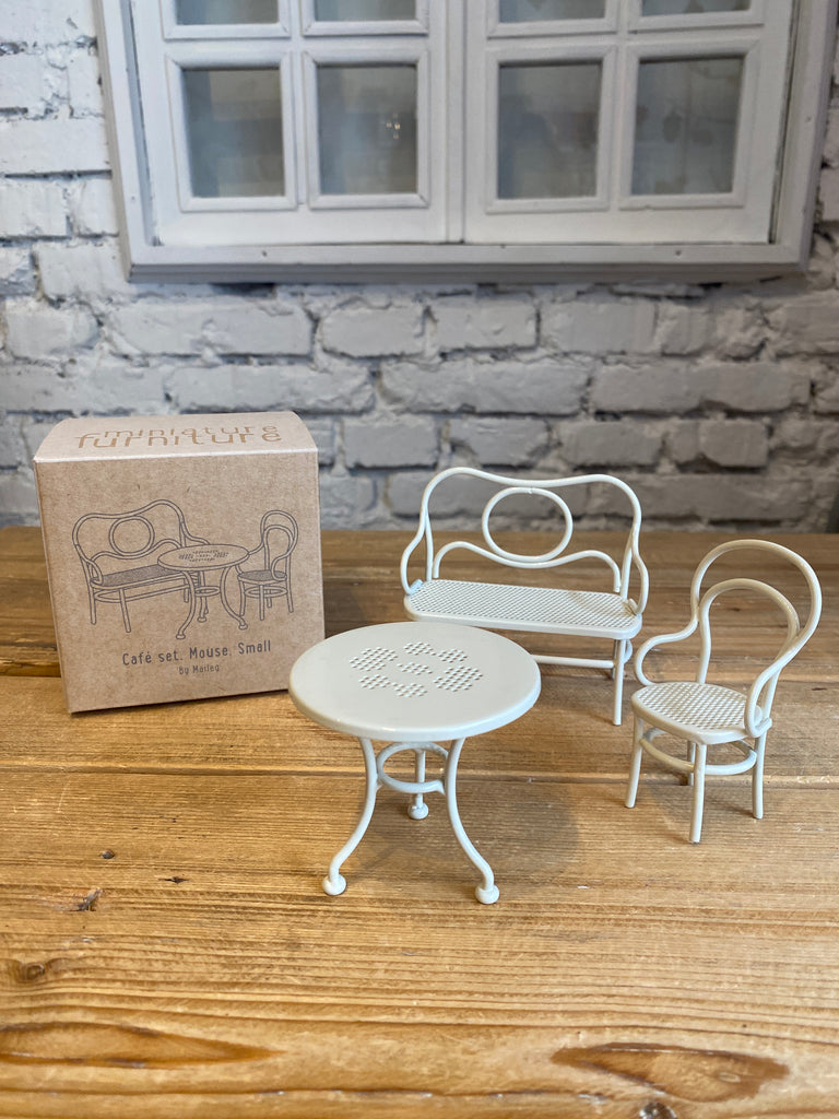 Kovové sedenie pre myšky na príjemné posedenie pri káve či čajíku. Balenie obsahuje lavicu, stoličku a stôl.