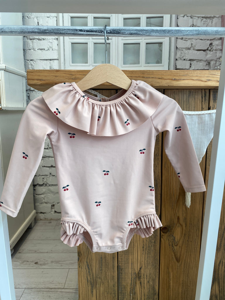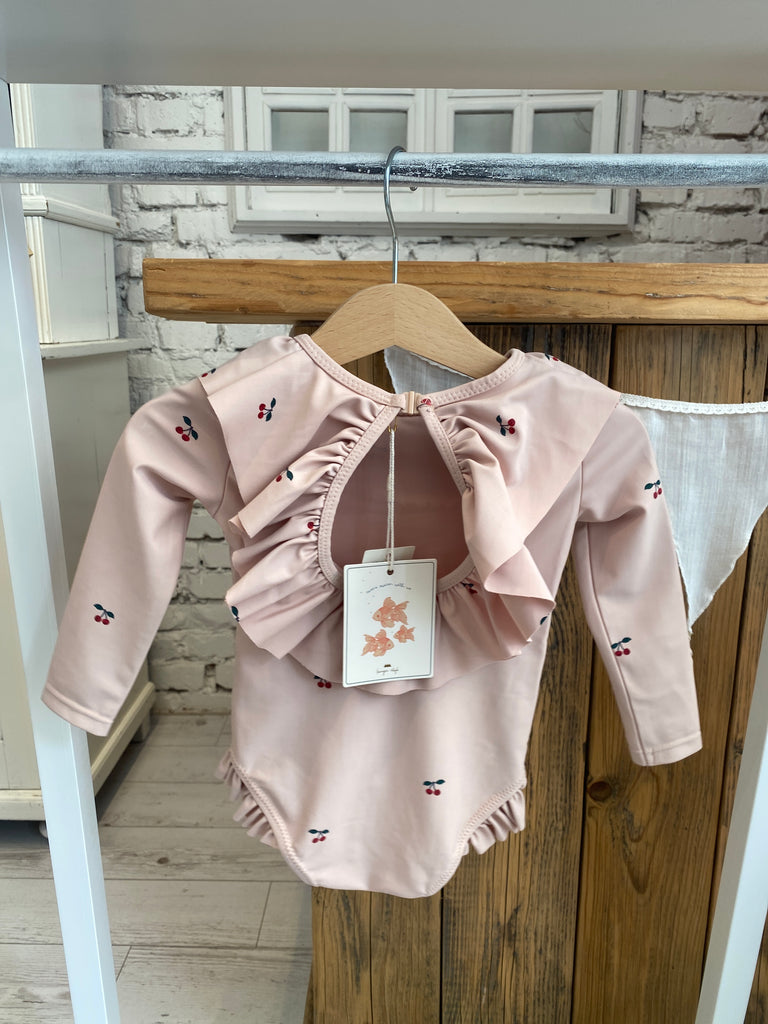 Plavky s dlhým rukávom, navrhnuté s veľkým zaobleným golierom a volánovými detailmi na otvoroch na nohách, vyrobené z recyklovaných plastových fliaš. Plavky majú otvorený chrbát s volánmi a šnúrku na zaväzovanie pri krku.
