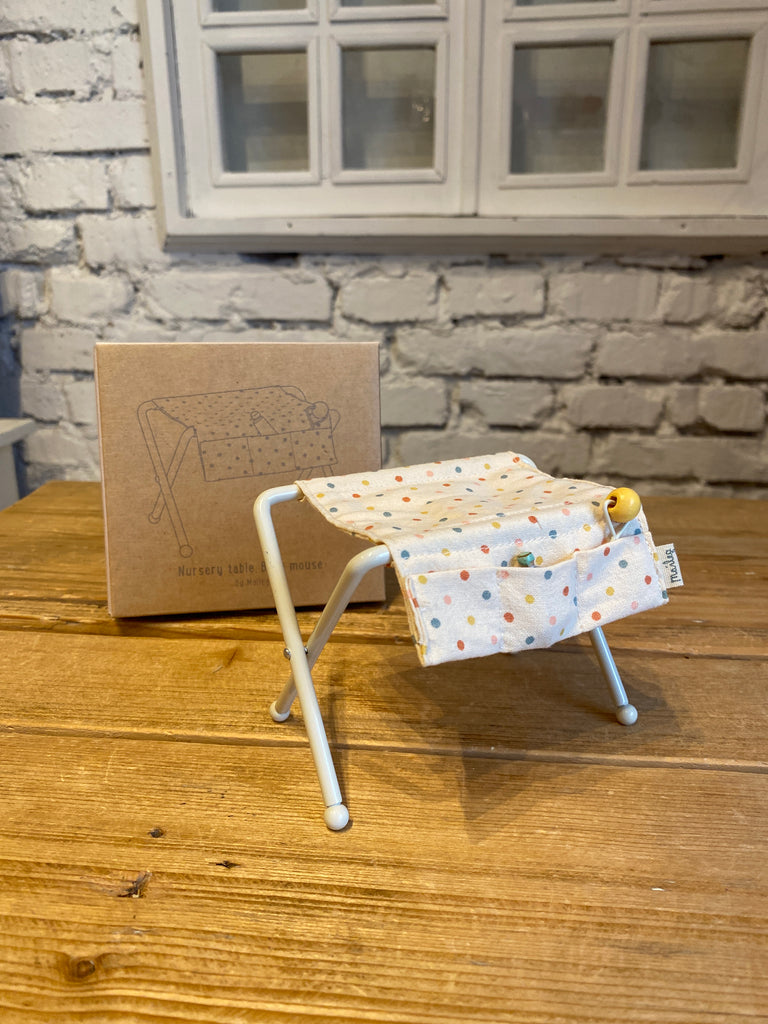 Tu prebalíš myšku malú, nech nemá plienku špinavú. Kovový putík som, na prebaľovanie ideálny som. Kovovú konštrukciu mám, krásnou kvetinovou látkou vynikám. SÚćasťou je aj mini tuba krému a hrkálka.