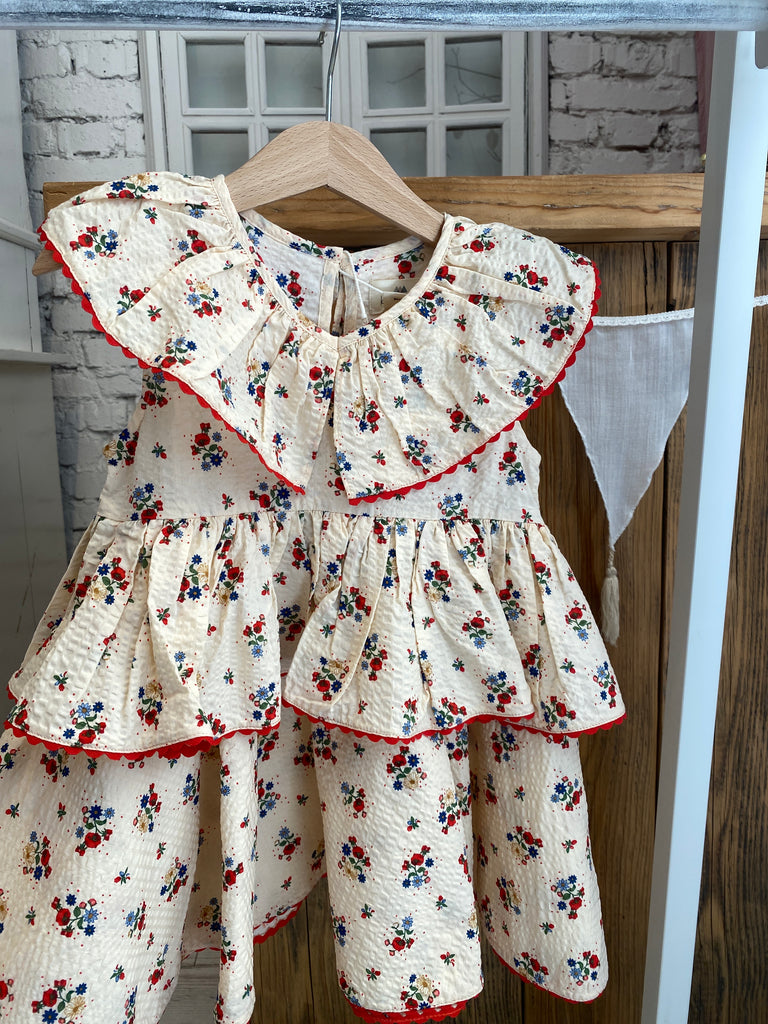 Šaty z orgaickej bavlny s jemných vzorom kvietkov. Obľúbeny strih od Konges Slojd, suknička sa krásne točí a volány dodajú ten správny šmrnc. S riflovou bundičkou využijete aj pri chlladnejšom. počasí.