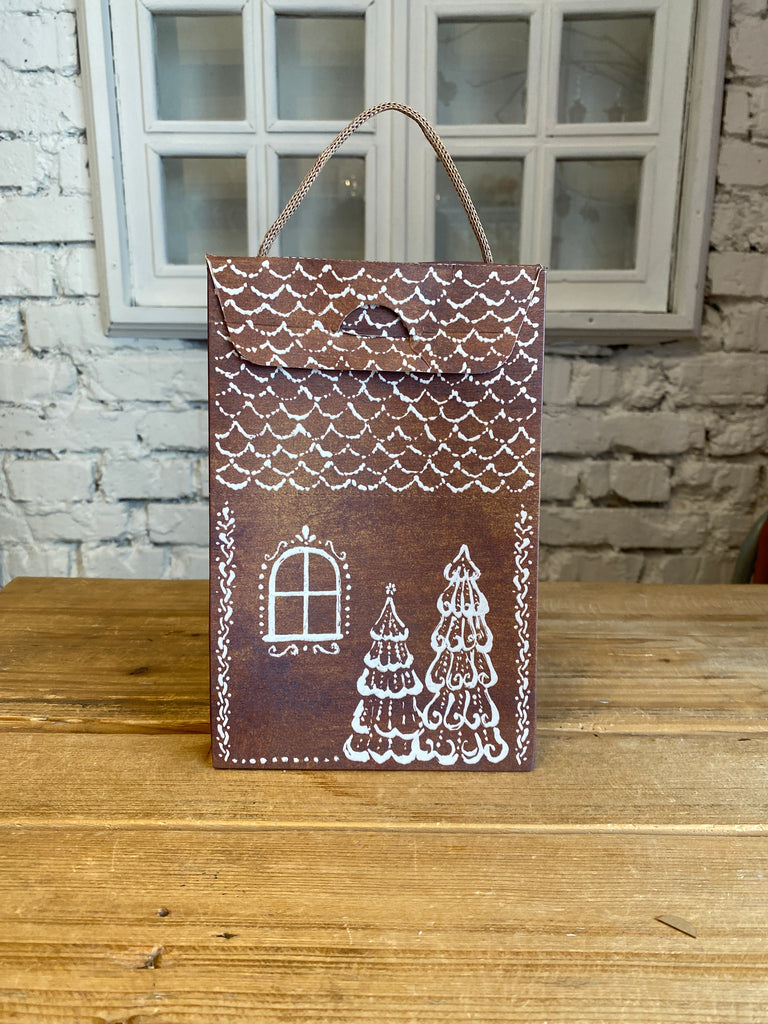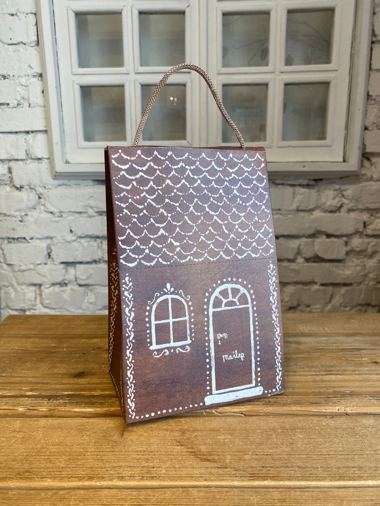štýlová taštička v tvare medovníkového domčeka. Je vyrobená z kartónu.