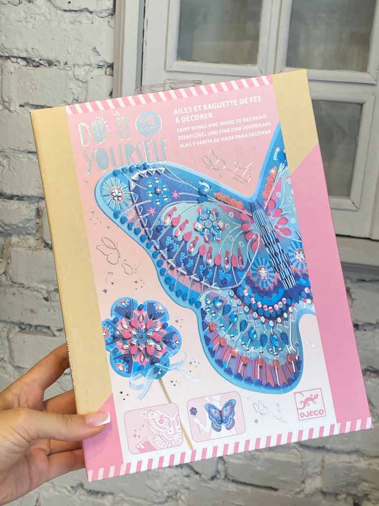 1 pár ilustrovaných krídel z odolného kartónu, 2 elastické popruhy, 1 čarovný prútik, 5 hárkov s trblietavými mozaikovými penovými nálepkami, 3 hárky s nálepkami „drahokamov“ + podrobný návod krok za krokom.