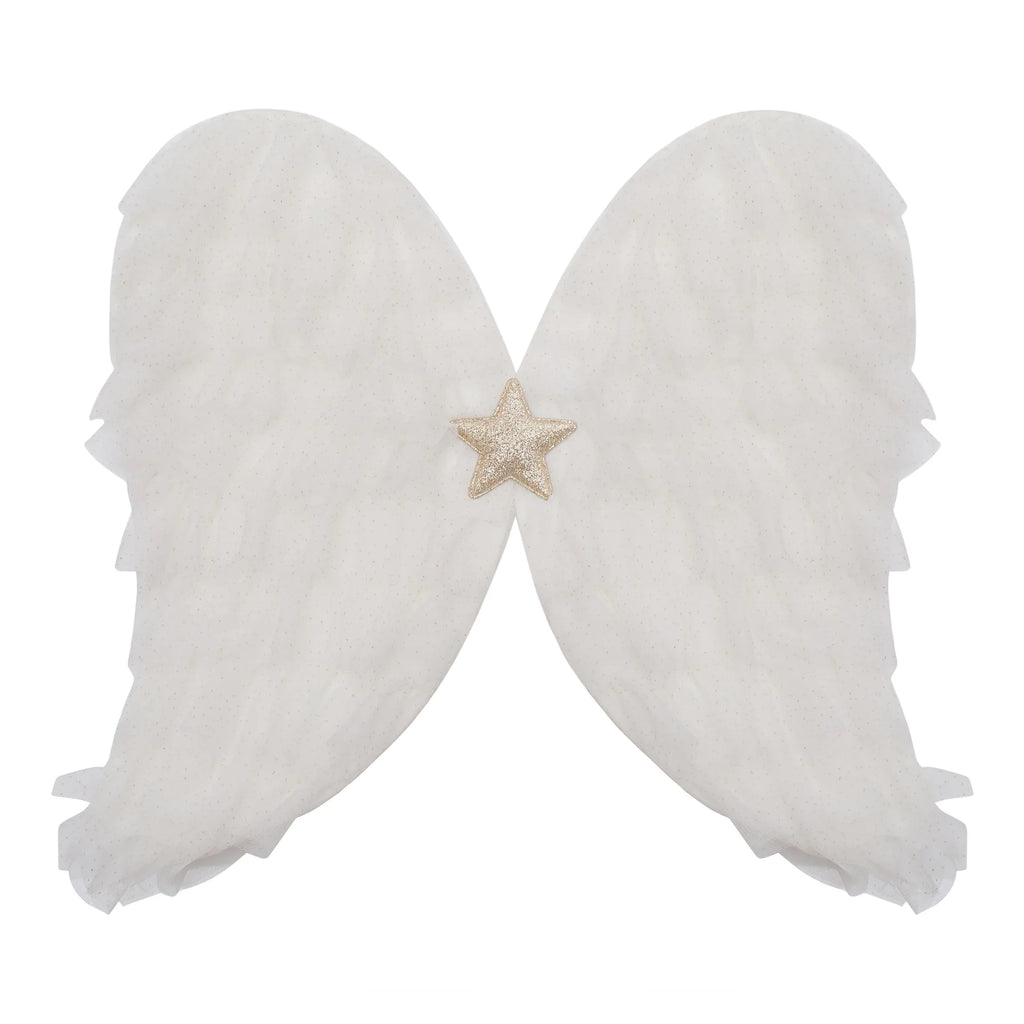 Krídla sú vyrobené z mäkkej bielej tylovej látky posiatej zlatými trblietkami a zdobené vypuklou hviezdou zo zlatého trblietavého materiálu v strede. Vďaka elastickým popruhom sa pohodlne nosia a dobre držia na chrbte.