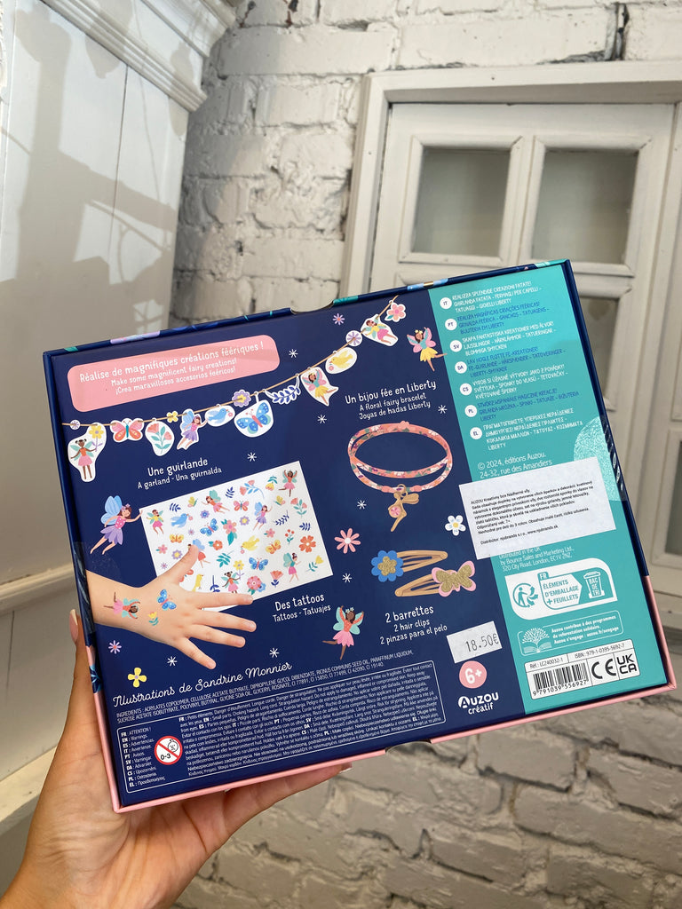 Sada obsahuje doplnky na vytvorenie vílich šperkov a dekorácii: kvetinový náramok s elegantným príveskom víly, dve roztomilé sponky do vlasov na vytvorenie dokonalého účesu, set na výrobu girlandy, jemné tetovačky, zlatú taštičku, ktorá je skvelá na uskladnenie vílích pokladov.