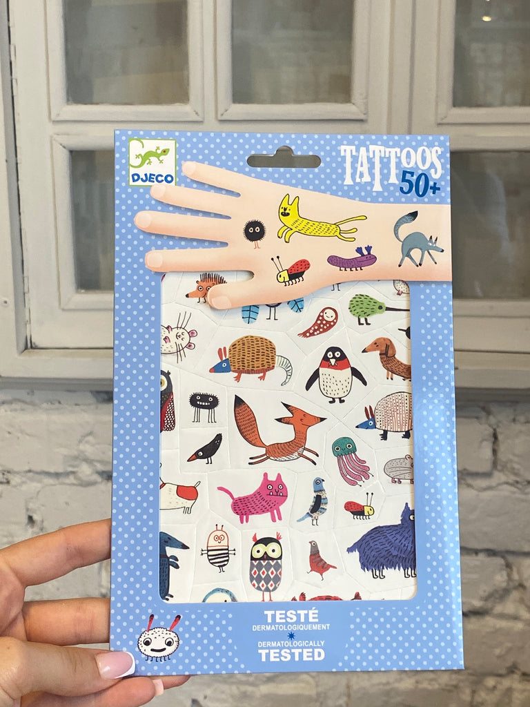 Dva hárky dočasných tetovaní plné zábavných a šibalských zvieratiek! Sú predrezané, takže sa ľahko používajú: stačí naniesť trochu vody. Dermatologicky testované.