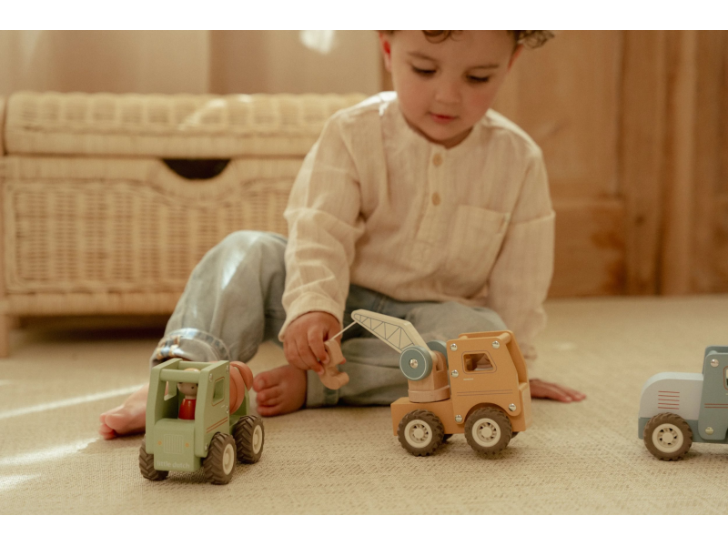 Súčasťou je aj drevená figúrka stavbára, ktorá dodáva hre realistický rozmer. Autožeriav môžete kombinovať s ďalšími stavebnými vozidlami - napríklad s nakladačom, miešačkou alebo sklápačkou - pre kompletné stavebné dobrodružstvo.