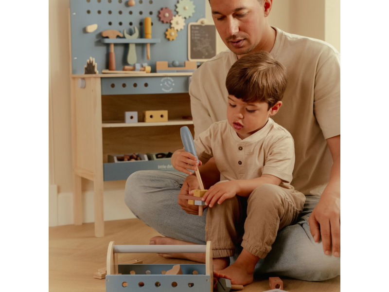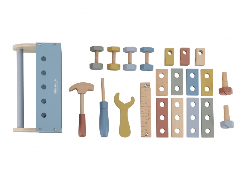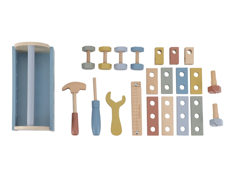 S touto sadou dreveného náradia v praktickom prenosnom boxe zvládne vaše dieťa opraviť doma všetko, čo je potrebné. Po ruke bude mať skrutkovač, kladivko aj francúzsky kľúč. V boxe sú aj skrutky, matice a panely s otvormi na tréning zručnosti. Box na náradie môže slúžiť aj ako zatĺkačka.