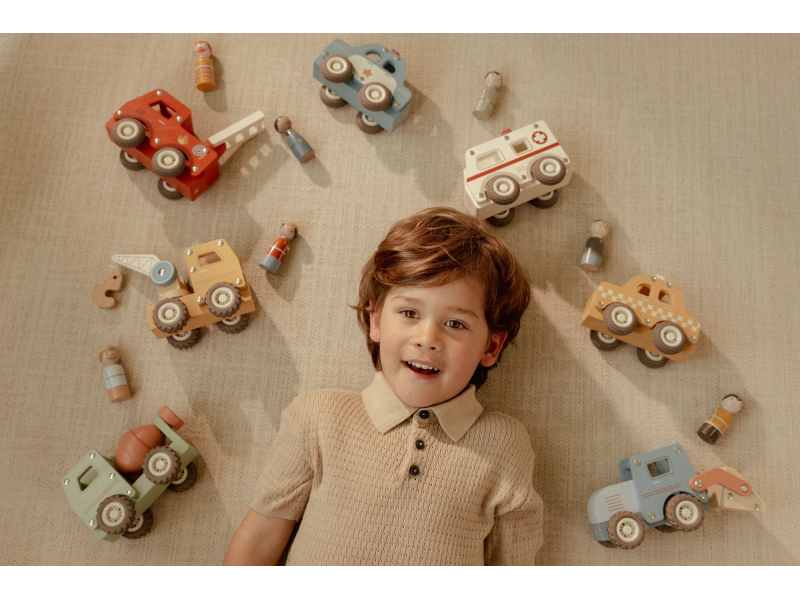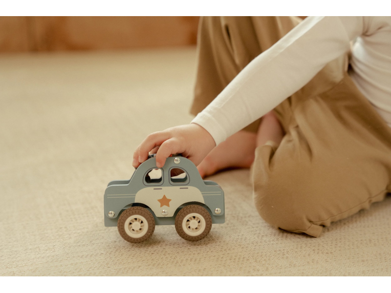 Stala sa nehoda alebo krádež? Drevené policajné auto sviští ulicami mesta priamo na miesto činu! S odvážnym policajtom za volantom a gumovými pneumatikami pre tichý a plynulý pohyb je pripravené chrániť a pomáhať.
