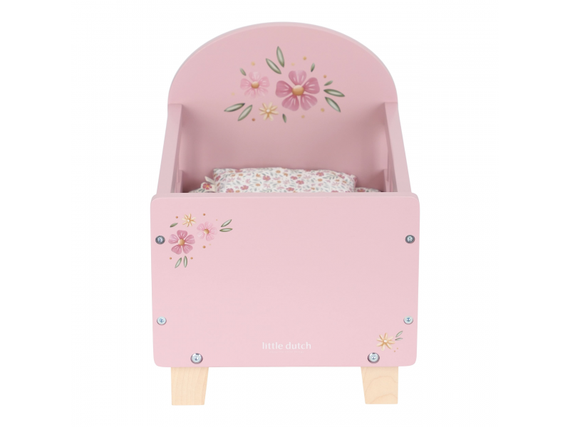 V tejto krásnej drevenej postieľke bude každá bábika spať mäkko a pohodlne. Súčasťou je mäkučký vankúšik, hrejivá perinka a matrac - všetko zladené v kúzelnom kvetinovom dizajne. Elegantné nôžky v prírodnej farbe a jemná kvetinová ilustrácia dodávajú postieľke romantický nádych a robia z nej nádherný doplnok každej izbičky.