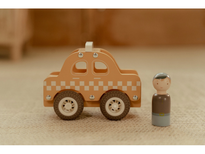 Naskočte a nechajte sa odviezť! Toto drevené taxi je pripravené bezpečne dopraviť každého cestujúceho do cieľa. Vďaka gumovým pneumatikám sa hladko pohybuje po podlahe a sympatický vodič už čaká, až vyrazíte na cestu.
