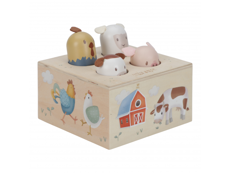 Zábavná a originálna hračka so zvieratkami z farmy bude baviť deti aj vás! Zatlačením na hlavičku zvieratka jedno zasuniete a druhé vyskočí, zároveň budete počuť zvuky, ktoré prasiatko, ovečka, kravička a sliepočka vydávajú.