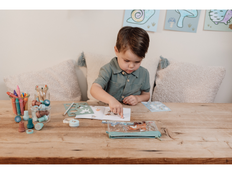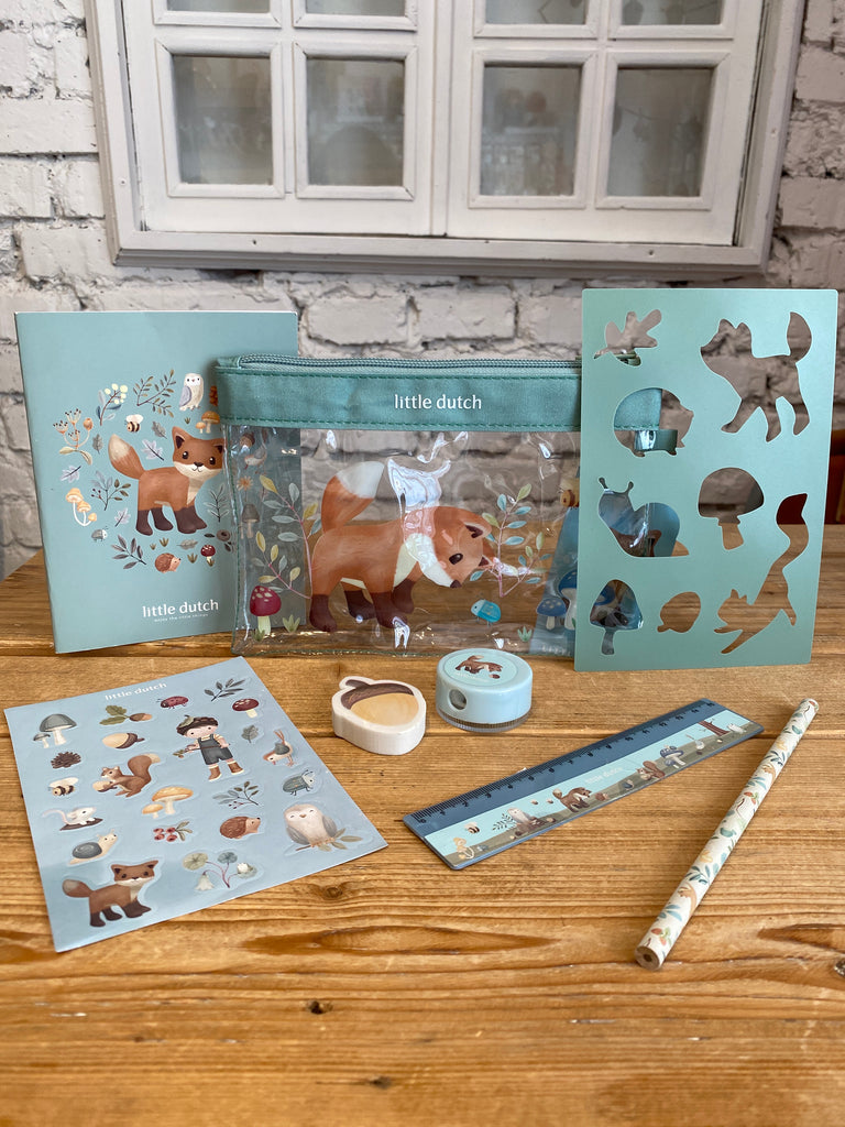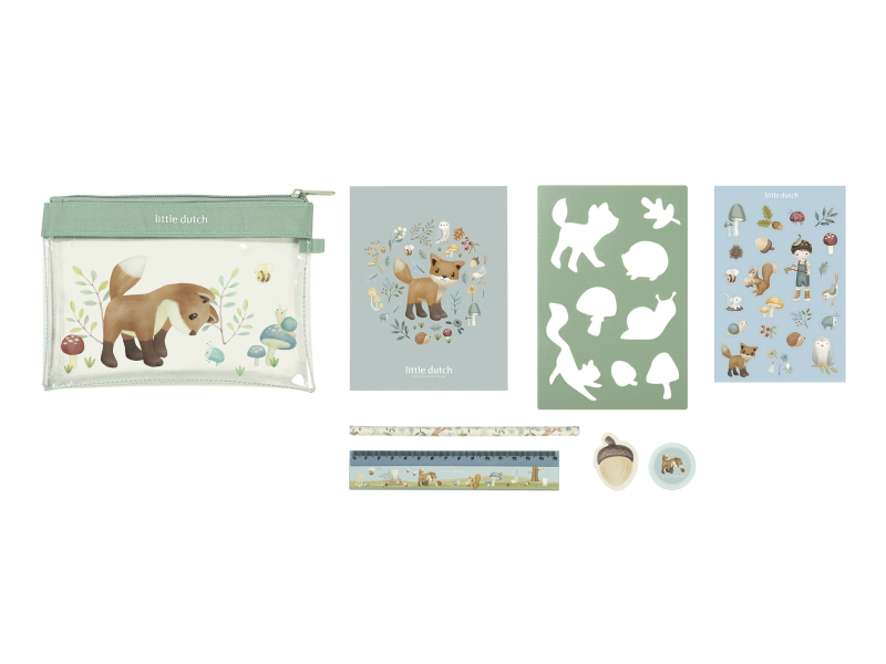 Sada výtvarných potrieb v krásnom prevedení s motívmi života v lese obsahuje priehľadné puzdro na zips, zošit, samolepky, pravítko, gumu, strúhadlo a šablóny.