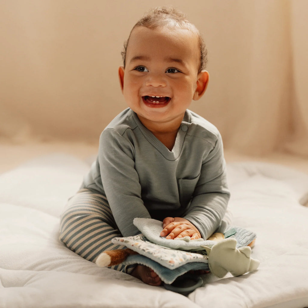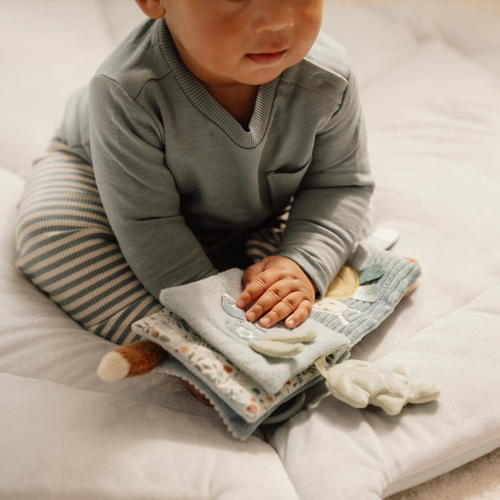 Mäkká textilná knižka s krásnymi motívmi zo života v lese upúta pozornosť vášho dieťaťa množstvom aktivít, ukrytých na jednotlivých stránkach. Na skúmanie a prezeranie lákajú šuštiace aj pískacie stránky, rôznorodé textúry alebo napr. bezpečné zrkadlo. Knižka pomáha rozvíjať jednotlivé zmysly dieťaťa aj koordináciu ruka/oko.