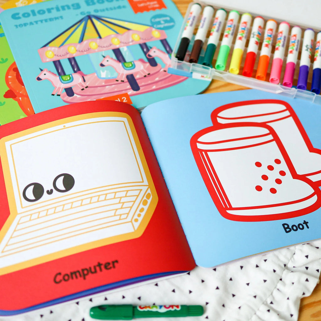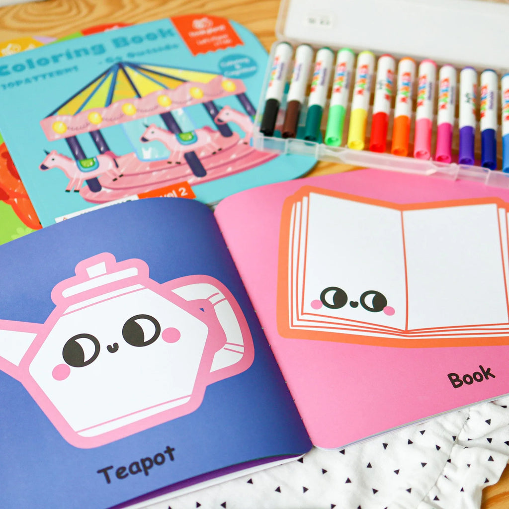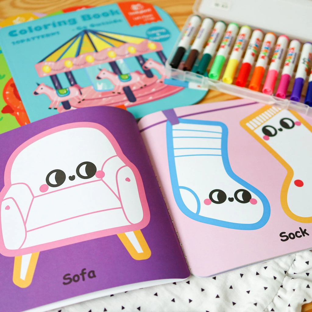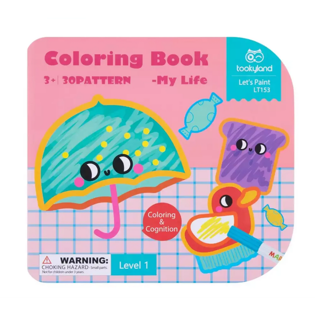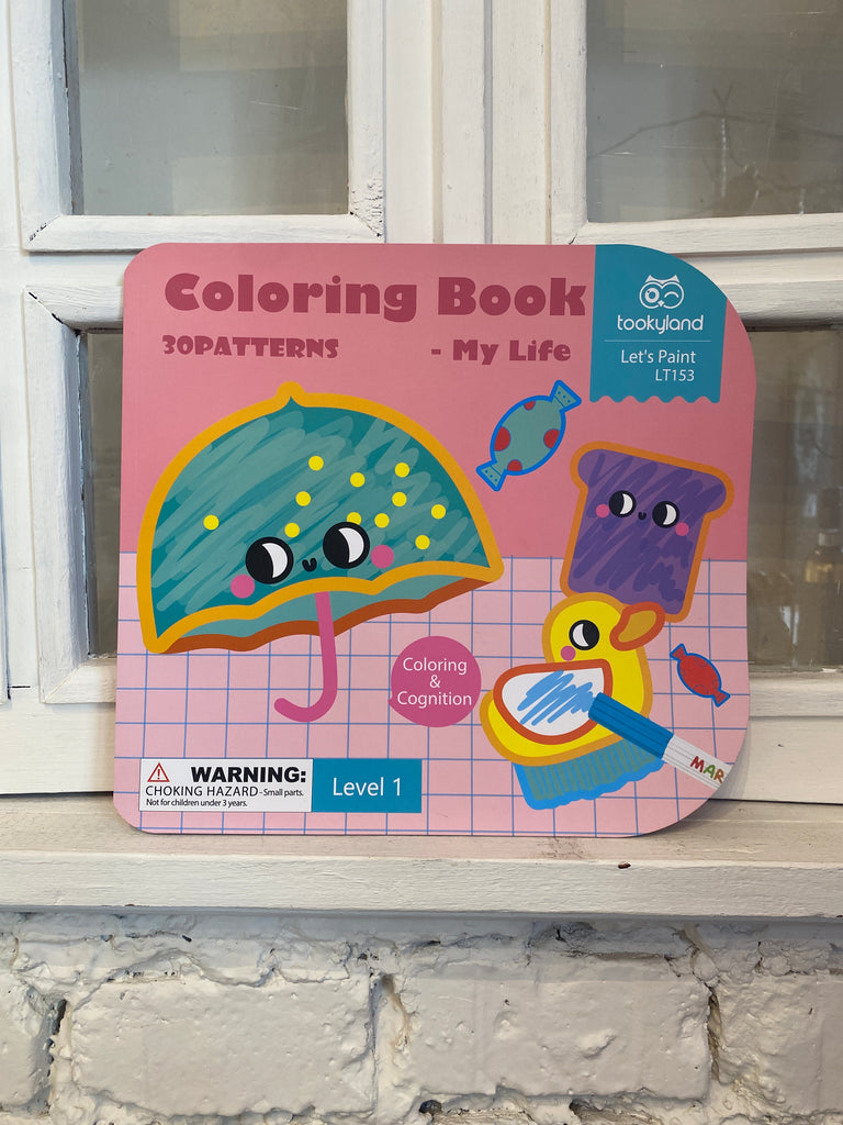 Deni sa môžu zoznámiť s bežnými každodennými predmetmi – ako dáždnik, hrianka či kanvica – a jednoduchým spôsobom rozvíjať jemnú motoriku, poznávať slovíčka a objavovať svet okolo. Navyše, hrubé obrysy obrázkov pomáhajú tým najmenším vyfarbovať s istotou – či už používajú voskovky alebo umývateľné fixky.