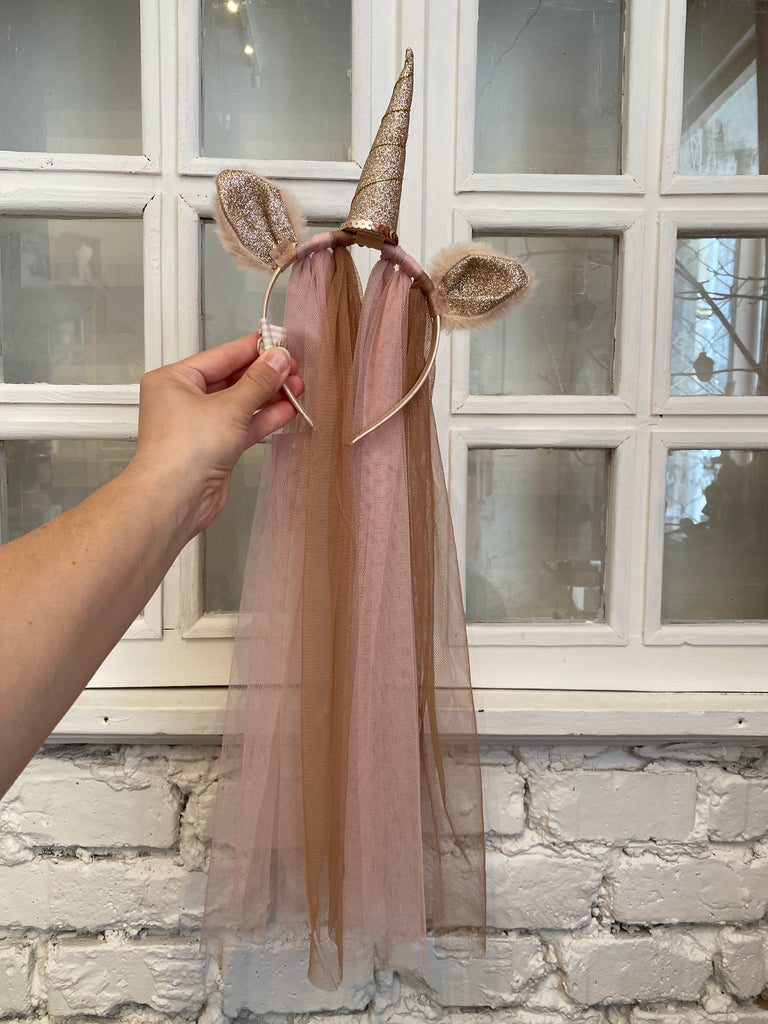 Doprajte svojmu dieťatku čarovný vzhľad s MRS. ERTHA Čelenkou so závojom Little Unicorn! Táto nádherná čelenka s jemným tylovým závojom v odtieňoch hnedej a ružovej, trblietavým rohom a lesklými uškami je dokonalým doplnkom pre každého milovníka vkusných jednorožcov.