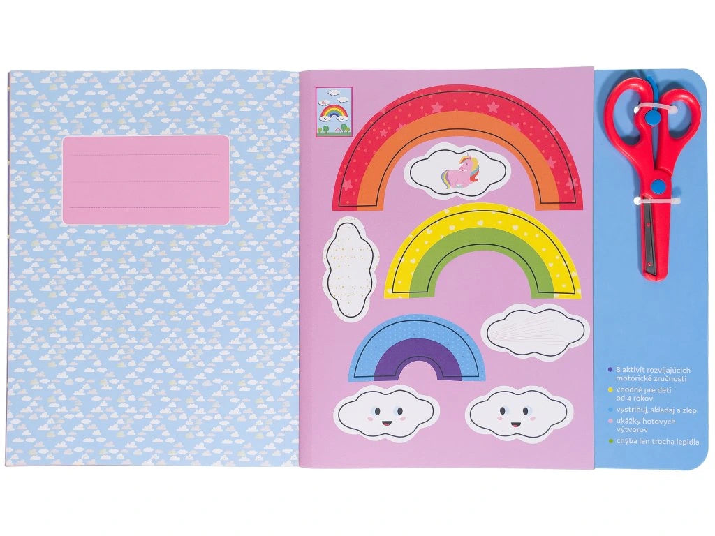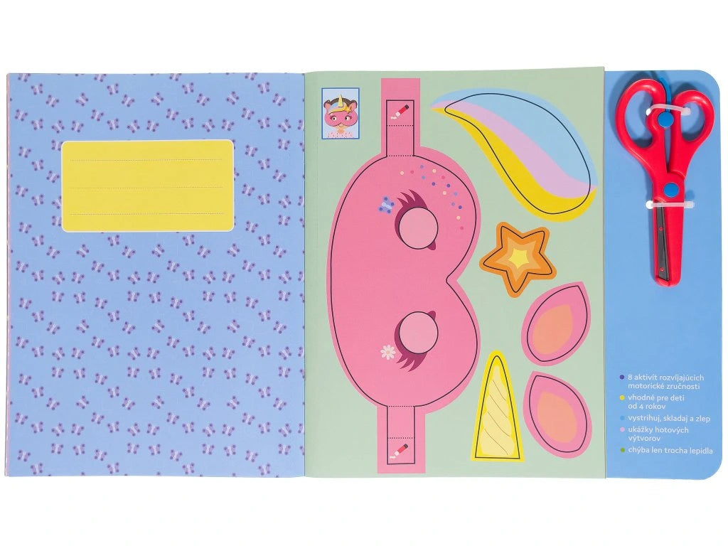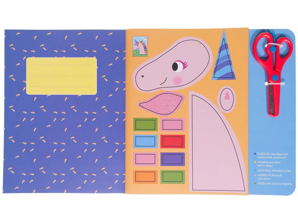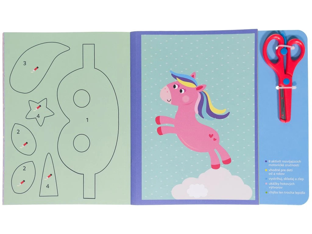 S týmto skvelým pracovným zošitom sa deti od 4 rokov naučia strihať, skladať a lepiť jednoduché tvary, z ktorých krok za krokom vytvoria trojrozmerné obrázky jednorožcov. Zoznámia sa s nožnicami, naučia sa ich držať a správne používať a ešte si pritom precvičia jemnú motoriku. Súčasťou zošita sú detské nožnice a vnútri nájdete všetok potrebný papierový materiál. Stačí si prizvať na pomoc lepidlo a zábavná tvorba sa môže začať!