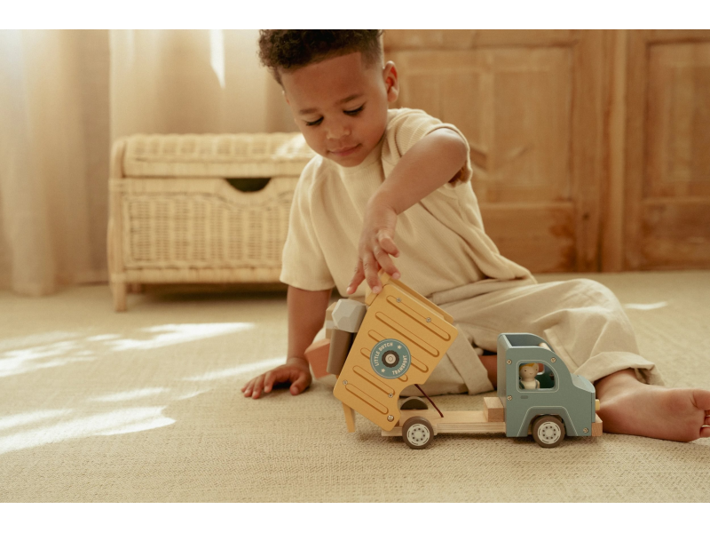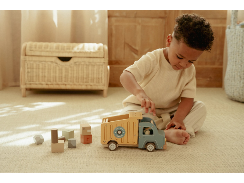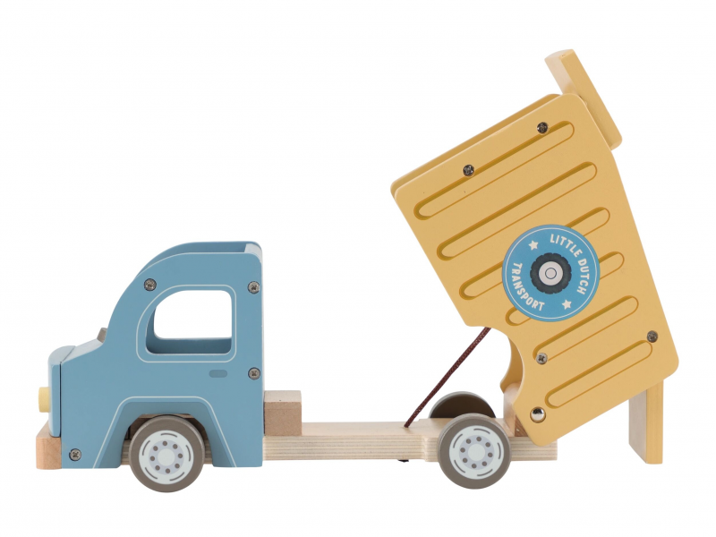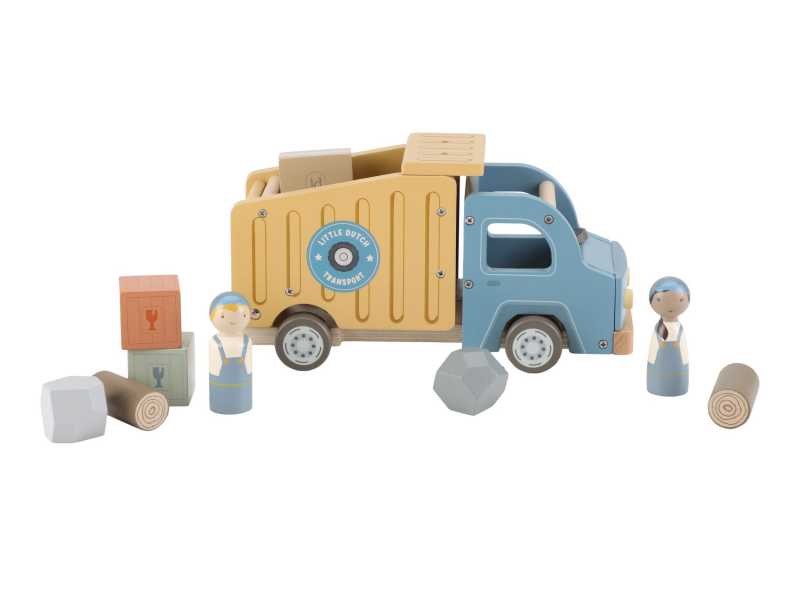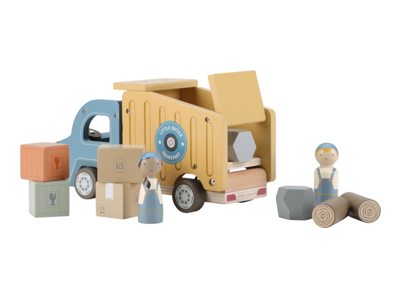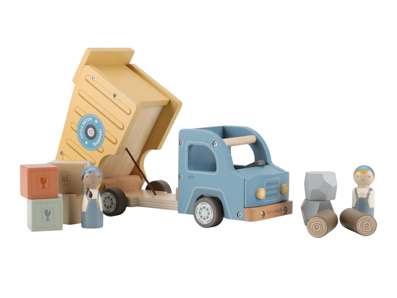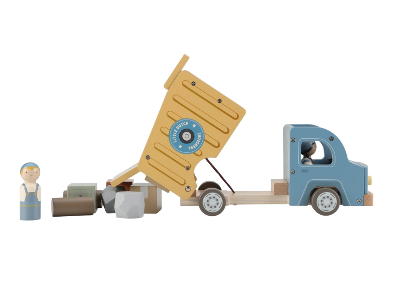 Nákladiak so sklápačkou je ideálna hračka pre malých staviteľov, ktorí chcú prevážať, vykladať a vymýšľať nové príbehy. Kvalitné drevené prevedenie s dôrazom na detail zaisťuje dlhú životnosť a hodiny kreatívnej hry. Auto má funkčnú sklápaciu korbu, vďaka ktorej deti ľahko naložia a vyložia svoj náklad. Súčasťou balenia sú dvaja vodiči a rôzne typy nákladu – klády, kamene a drevené debničky. Deti tak môžu vymýšľať stále nové príbehy, rozvíjať fantáziu a precvičovať jemnú motoriku.