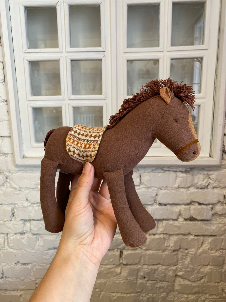 Tento hnedý poník Maileg je vyrobený z mäkkej bavlny a ľanovej látky, ktorá je príjemná na dotyk a zaručuje kvalitné spracovanie. Hriva a chvost sú z bavlnených šnúrok, čo poníkovi dodáva realistický vzhľad a jemnosť.