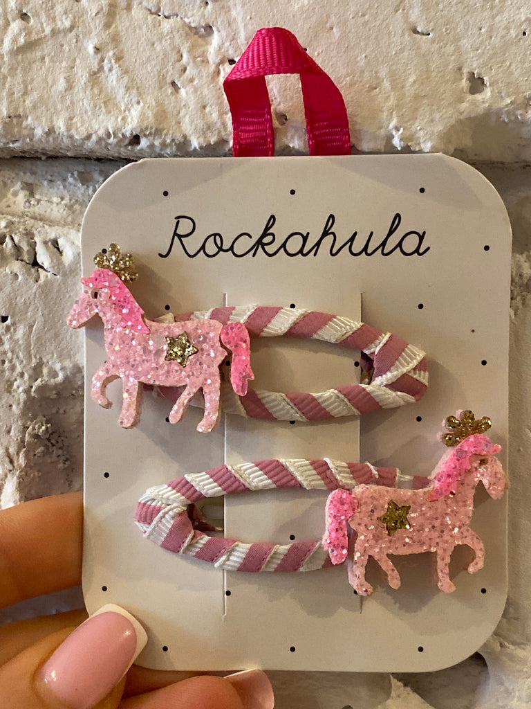 Tieto sponky sú čistá poníková radosť — prichádzajú s dvoma trblietavými ružovými poníkmi, každý s korunkou v zlatej farbe, pripravený pustiť sa do dobrodružstva! Každý poník je umiestnený na jasne ružoovo prúžkovanej sponke obalenej látkou.