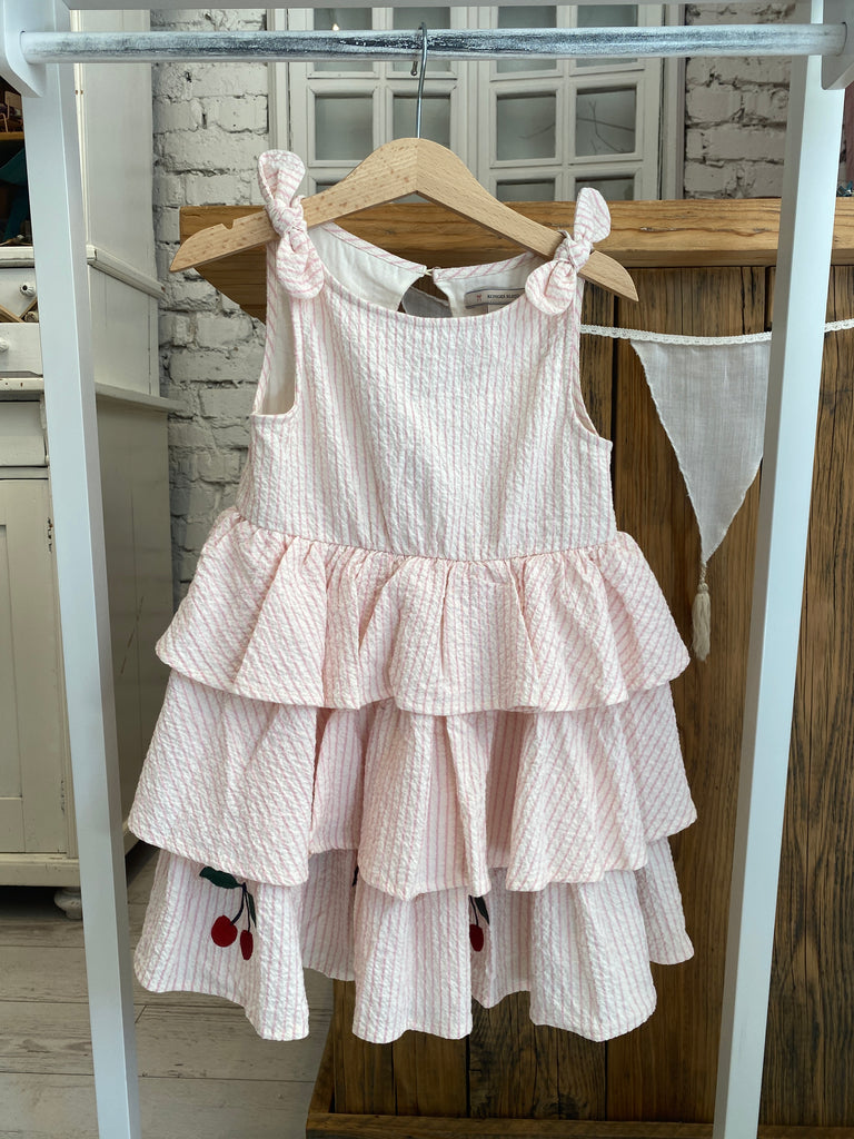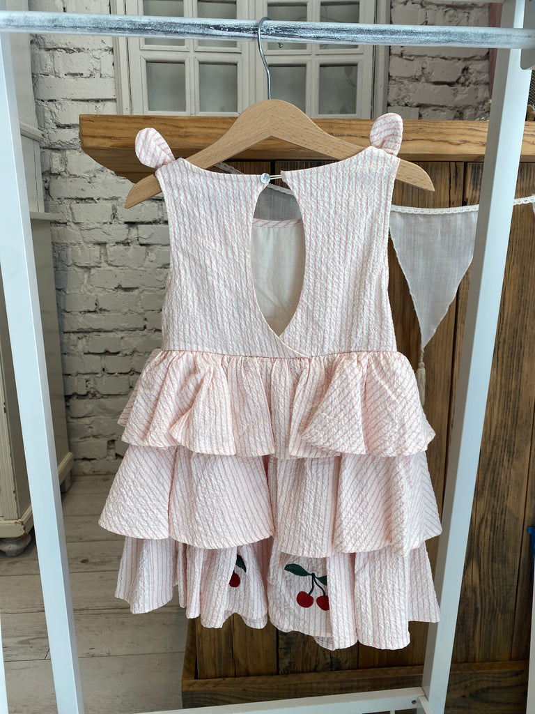 Šaty s riasenou sukňou, s obľúbeným dizajnom čerešní. príjemný materiál, spodná časť sa bude krásne točiť. Na chrbátiku je slzička so zapínaníma na pleciach jemný detial v podobe mašličiek.