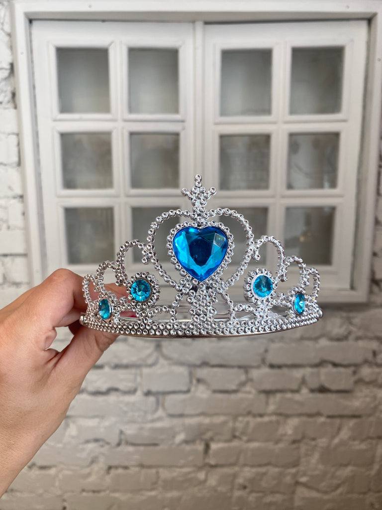 Táto čarovná korunka s veľkým modrým srdiečkom uprostred a trblietavými kamienkami je sen každej malej princeznej! Je elegantná, ligotavá a dokonale sa hodí na kráľovský ples, narodeninovú oslavu alebo každodenné rozprávkové hranie. Krásne drží na hlavičke aj pri tanci! 👑💃