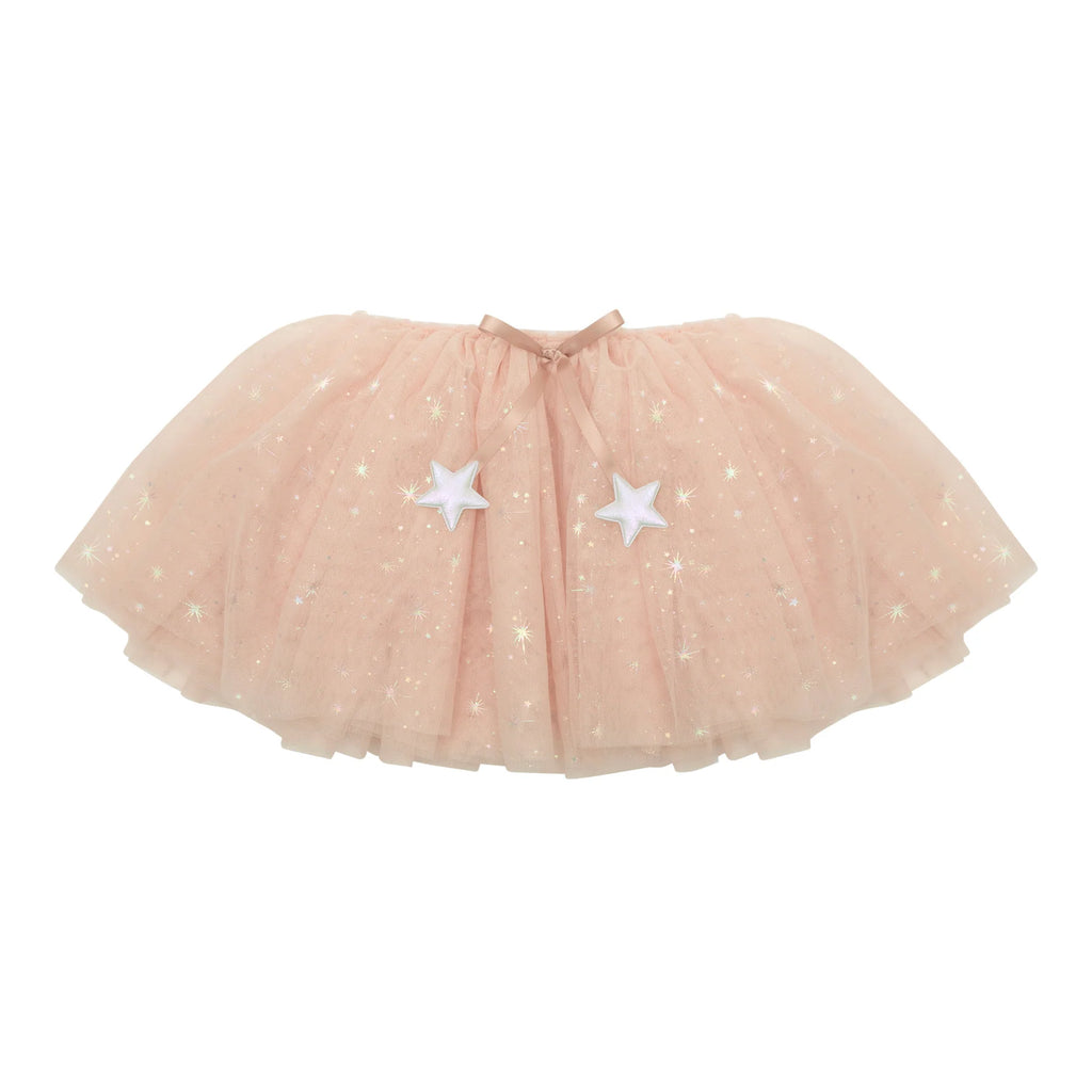 Dodajte kúzlo každému dňu s touto rozkošnou tutu sukničkou Shimmer od značky MIMI&LULA. Vyrobená z jemného tylu v odtieni ružovej broskyne, posiata zlatými hviezdičkami a ozdobená dvomi hviezdami vpredu – ideálna pre všetky malé parádnice, ktoré milujú rozprávkový štýl.