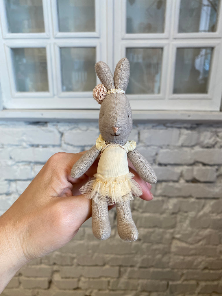 Známý Maileg micro zajačik oblečený ako baletka! Tento malý tanečník má na sebe elegantný kostým s tylovou sukničkou a drobnú ozdobu okolo vystretých ušiek, ktorá mu dodáva šarm a jedinečný vzhľad.