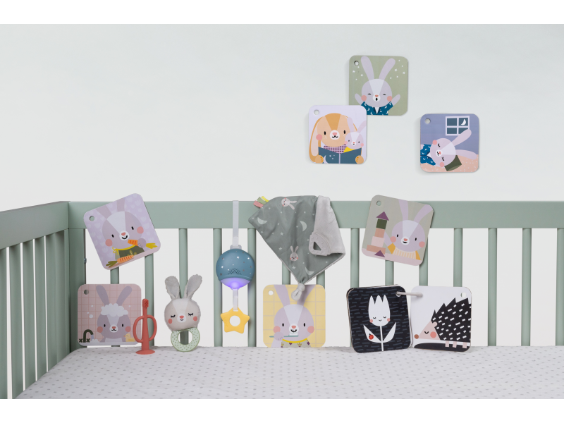 Sada obsahuje jemné nočné svetielko hudbou, mäkkú silikónovú kefku na zúbky, maznáčika s hryzátkom, hryzátko zajačika a 7 obojstranných ilustrovaných kariet s krúžkom na spájanie.