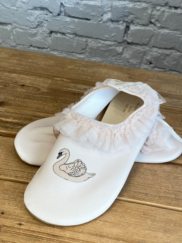 Topánočky do vody sú vyrobené z 95 percent polyesteru a 5 percent elastanu s ozdobným volánom. Majú flexibilnú protišmykovú gumenú podrážku a ľahko sa obúvajú. Topánky sú praktické na deň na kamenistej pláži alebo na deň pri šmykľavom bazéne. Pružná tkanina chráni pred slnečným UV žiarením s najvyšším ultrafialovým ochranným faktorom UPF 50+.