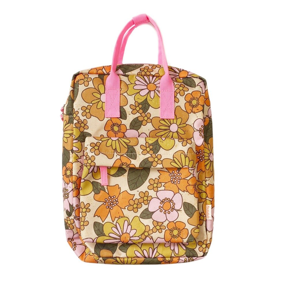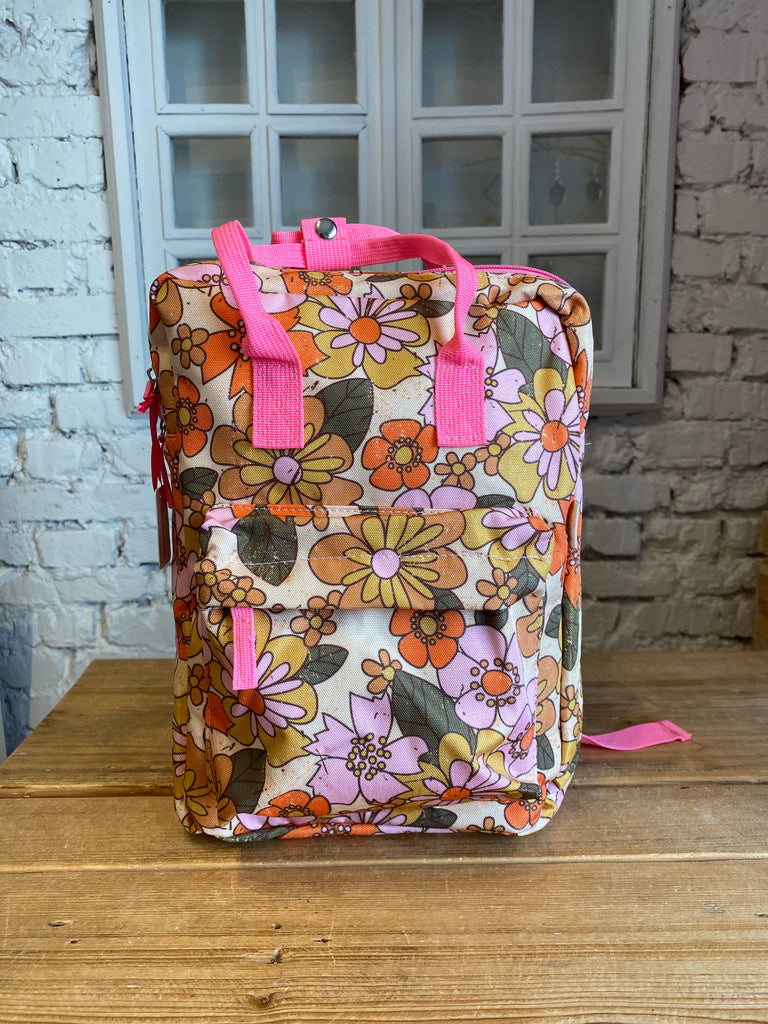 Štýlový batoh s retro kvietkami ktorý viete skombinovať s čelenkou v rovnakom dizajne z našej ponuky.
