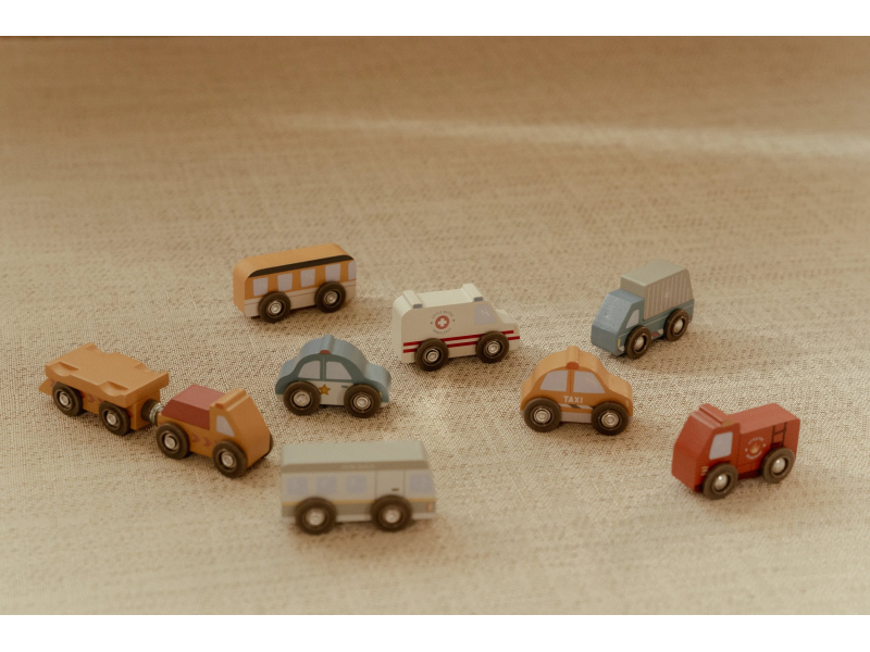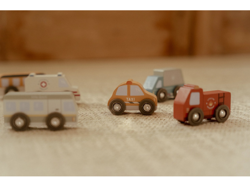 Mesto je stále v pohybe! Táto sada drevených vozidiel rôznych profesií je pripravená vyraziť do akcie a pomáhať tam, kde je treba. Hasičské auto vychádza k požiaru, policajné vozidlo hliadkuje po meste a nákladné auto dováža zásoby - každý deň prináša nové dobrodružstvo.