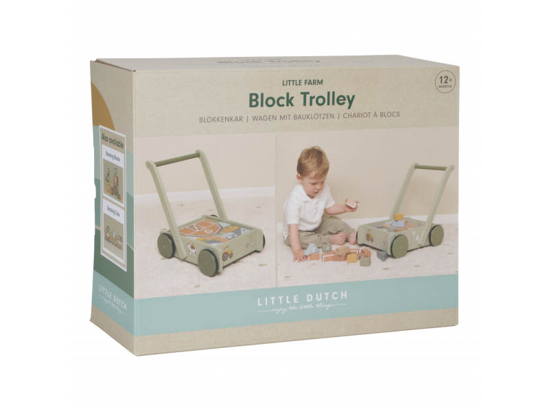 Drevený vozíček je vybavený kolesami s gumovým pruhom a je naplnený farebnými drevenými kockami rôznych tvarov. Rukoväť je v ideálnej výške pre batoľatá, aby mohli vozíček pekne tlačiť pred sebou.