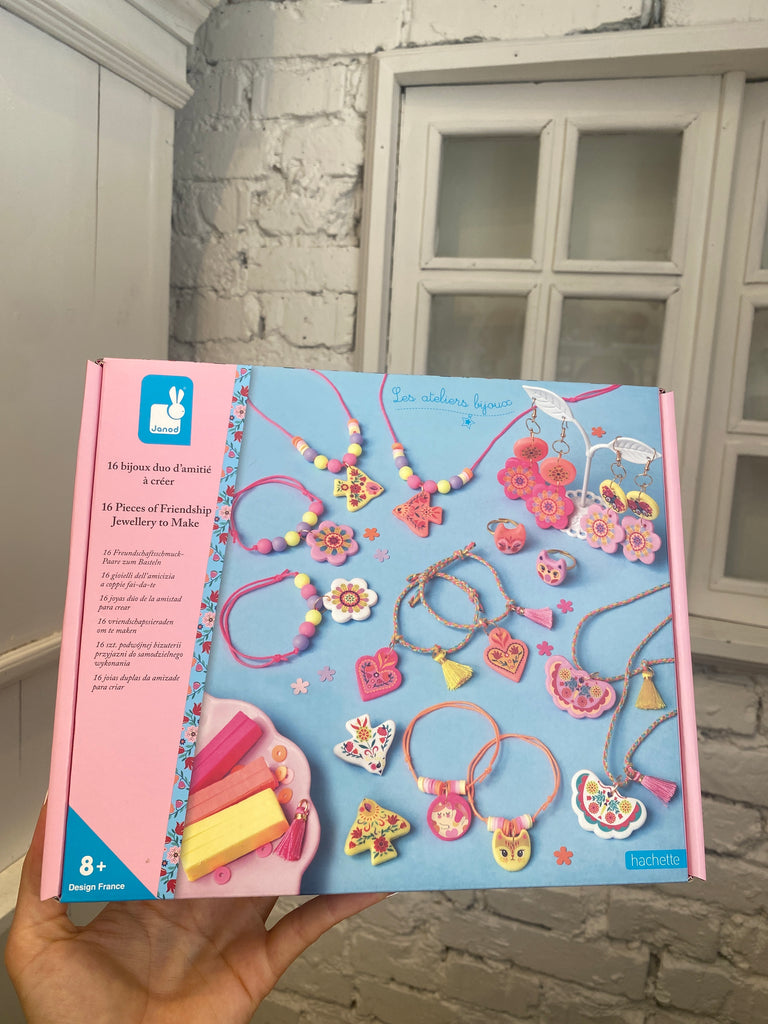 "Jeden šperk pre mňa, druhý pre teba! S touto sadou na výrobu šperkov môžu deti vytvoriť 16 šperkov (t.j. 8 párov) už od 8 rokov. Prísľubom tejto sady je ponúknuť svojim blízkym šperk podobný ich vlastnému ako prejav náklonnosti. Od náhrdelníkov po náramky, náušnice a dokonca aj brošne... Táto sada je pre priateľky ale môžete potešiť aj seba. Trpezlivosť a šikovnosť, ale aj dobrá príležitosť prejaviť svoj štýl a náklonnosť prostredníctvom svojich výtvorov, navyše, nosenie vlastných ručne vyrobených šperkov vám pomôže rozvíjať sebavedomie a presadiť vašu osobnosť. Milujeme dlhotrvajúci vzhľad a kvetinový bohémsky štýl týchto súprav, ktoré určite potešia malých aj veľkých. špáradlo, 1 tuba lepidla, 6 vykrajovačiek, oranžová a ružová niť, zapletaná niť, 2 držiaky na prstene, 4 držiaky na náušnice, 22 spojovacích krúžkov, 4 bambulky, 64 guľôčok heishis, 24 guľatých guľôčok, 1 obtiskový hárok s dreveným nástrojom. Súčasťou je aj brožúrka so vzormi a návodmi, ktoré deti prevedú aktivitou. Všetko potrebné pre kompletnú šperkársku dielňu je v cene! Pri vypaľovaní šperkov v rúre je potrebná pomoc dospelej osoby a pred zdobením sa šperky musia nechať vychladnúť asi desať minút. Tento kreatívny koníček je veľmi kompletný a bude veľkým hitom u 8-ročných detí: v tomto veku skúmajú nové kreatívne techniky a milujú výrobu vlastných šperkov, ktoré nemajú konkurenciu! S kým sa teda spojíte?