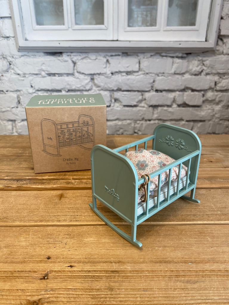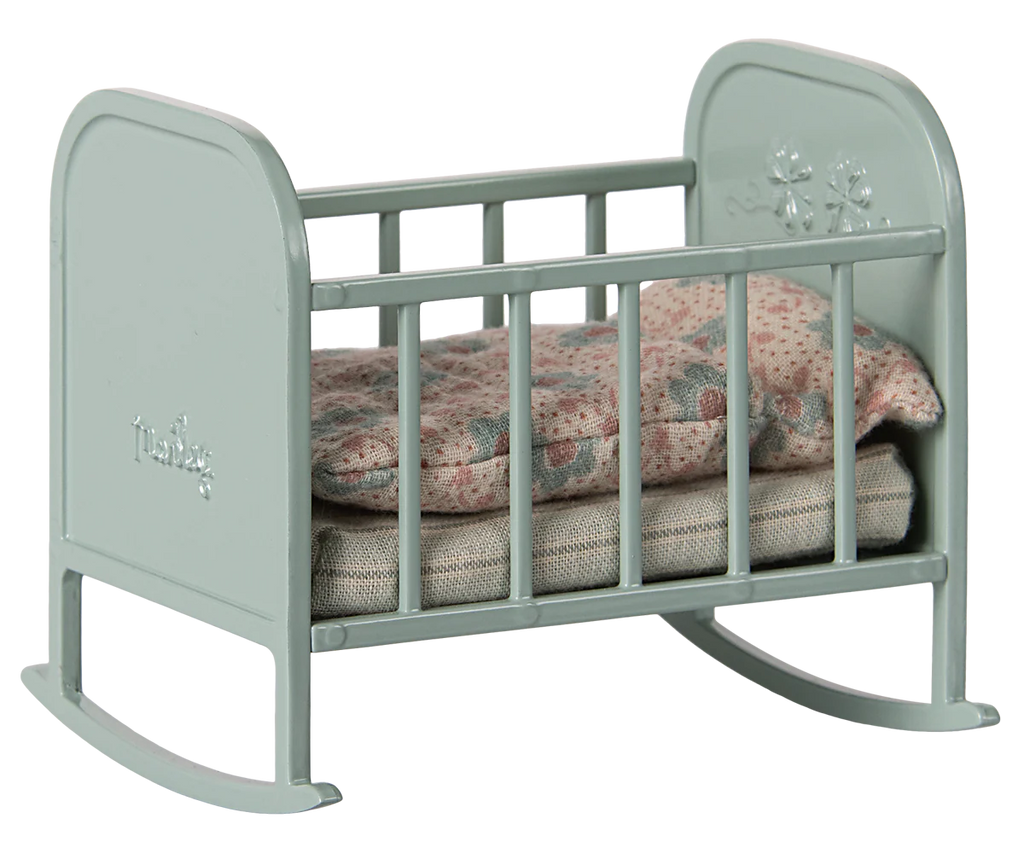 Romatická kovová kolíska pre myšky s matracom a perinkamis drobným vzorom.