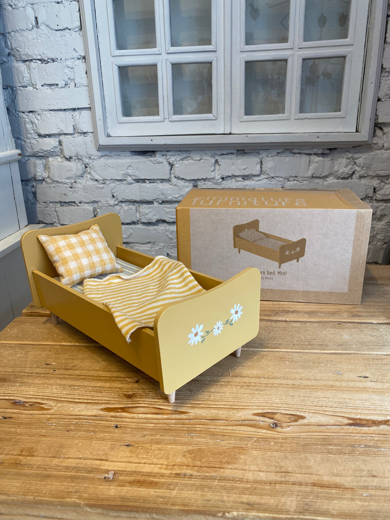 Drevená postieľka, ktorá má jemný detail kvietkov, jemné perinky pre sladké sníčky. Zajko nie je súčasťou postieľky.