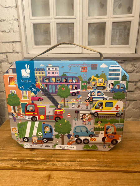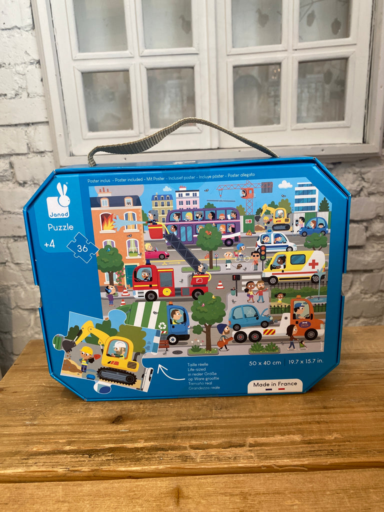Pestrofarebné kartónové puzzle Janod s motívom Mesto balené v kufríku. Tieto kartónové puzzle s 36ks dielikmi určite očaria a zabavia nejedno malé dieťatko. Puzzle sú balené v originálnom a praktickom kufríku so zatváraním, takže sú vždy upratané a zároveň sú pekným doplnkom do detských izbičiek. Súčasťou balenia je aj plagát, ktorý sa môže použiť ako šablóna. Puzzle rozvíja logické myslenie, pozornosť, pamäť, predstavivosť, jemnú motoriku, a zároveň sa deti učia vnímať vzťah medzi časťami a celkom. Ideálny tip na darček, vďaka krásnemu baleniu v kufríku.