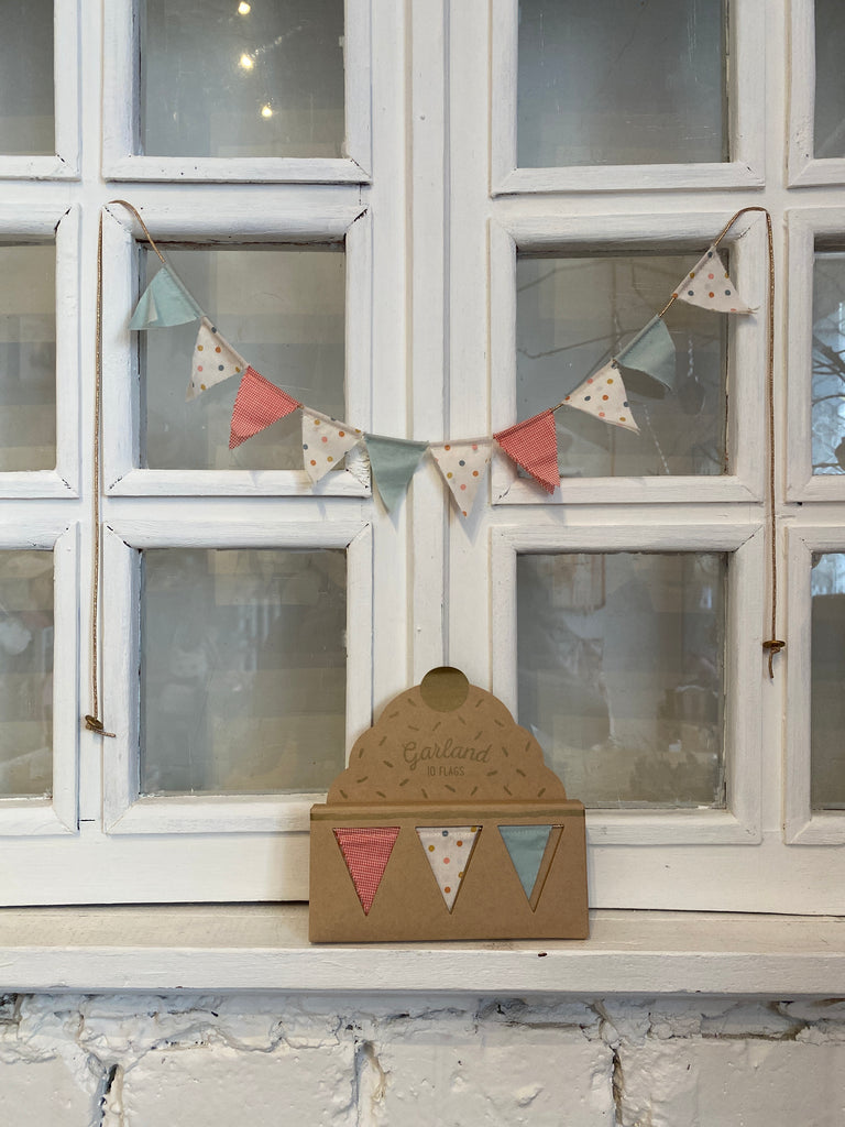 roztomilá girlanda s desiatimi vlajkami, ozdobí Maileg domček či detskú poličku v izbičke. Zakončená je dvomi kovovými krúžkami s logom.